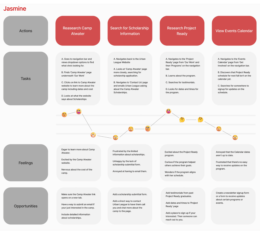 Based on our user research we created personas for our main types of users. We then used these personas to go through a user flow they would take and listed perceived pain points from their perspective.